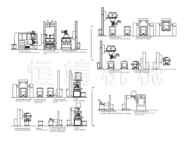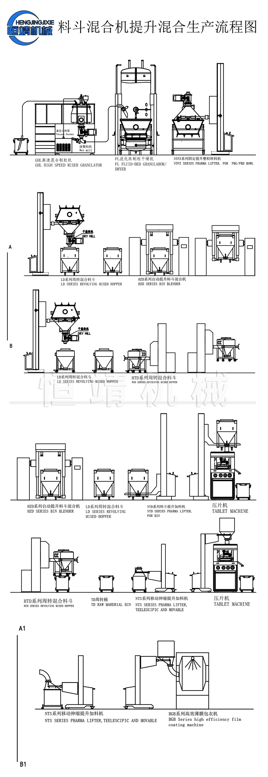 将配备好物料的周转料斗推至与湿法制粒机机旁→向湿法制粒机中真空加料→经过制粒→湿整粒→干燥→物料提升(干物料)整粒→干整完后的颗粒落入周转料桶→接料结束将周转料桶推至总混合机提升加料至总混料筒→总混后的物料分料落入周转料斗→将周转料斗通过提升向压片机(或胶囊充填机)加料→使用后的料斗推到清洗中心清洗。