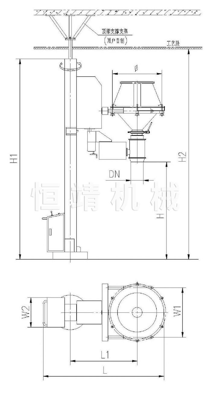 工作时,将锥形料斗与一步制粒机(或干燥机)的物料床(锅)扣合,锁紧锥斗,使两者扣成一体,启动提升按钮,料仓提升;启动翻转按钮,料仓可翻转180度。打开解锁按钮,水平旋转立柱到工艺要求位置,再下降料仓到工作高度,开启整粒机,打开蝶阀,使物料经过整粒后密闭转移到下一工序。