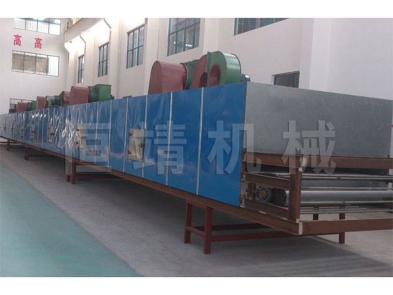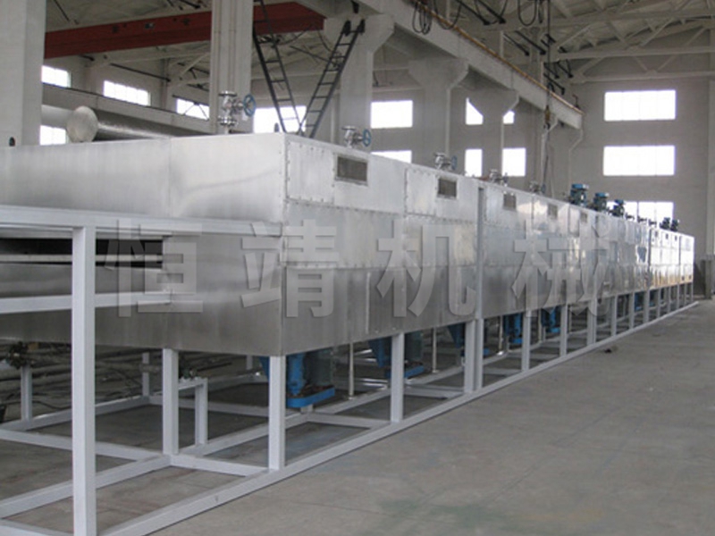 物料由加料器均匀地铺在网带上,网带一般采用12-60目不锈钢丝网,由传动装置拖动在干燥机内移动。干燥机由若干单元组成,每一单元热风独立循环,部分尾气由专门排湿风机排出,废气由调节阀控制,热气由下往上或由上往下穿过铺满物料的网带完成热量与质量传递的进程,带走物料水份。网带缓慢移动,运行速度可根据物料温度自由调节,干燥后的成品连续落入收料器中。上下循环单元根据用户需要可灵活配备,单元数量亦可根据需要选取。