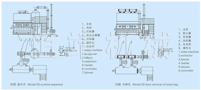 沸腾干燥,又称流化床,它是由空气过滤器、加热器、沸腾床主机、旋风分离器、布袋除尘器、高压离心风机、操作台组成,由于干燥物料的性质不同,配套除尘设备时,可按需要考虑,可同时选择旋风分离器、布袋除尘器,也可选择其中一种,一般来说比重较大的如冲剂及颗粒物料干燥只需选择旋风分离器,比重较轻的小颗粒状和粉状物料需配套布袋除尘器,并备有气力送料装置及皮带输送机供选择。