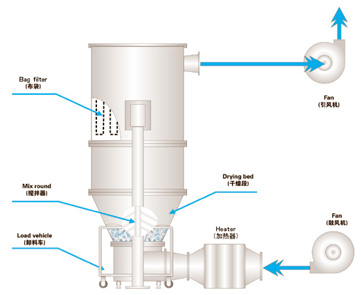 散粒状固体物料由加料器加入流化床干燥器中,过滤后的洁净空气加热后由鼓风机送入流化床底部经分布板与固体物料接触,形成流态化达到气固的热质交换。物料干燥后由排料口排出,废气由沸腾床顶部排出经旋风除尘器组和布袋除尘器回收固体粉料后排空。
