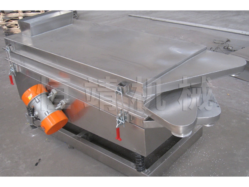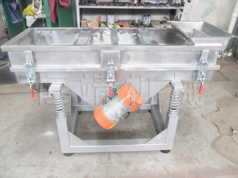 本机上部采用快拆式手柄,把整机连成一个整体,上盖全密封、有效防止物料在过筛时由于振动而产生粉尘飞扬。筛体下部安装振动电机,有效保证了物料的结构紧凑,下部采用弹簧减振,使整机在平稳状态下工作。下面底座采用可调式,可调节正在过筛时的筛面倾斜角度,根据物料特性以取得过筛效果。